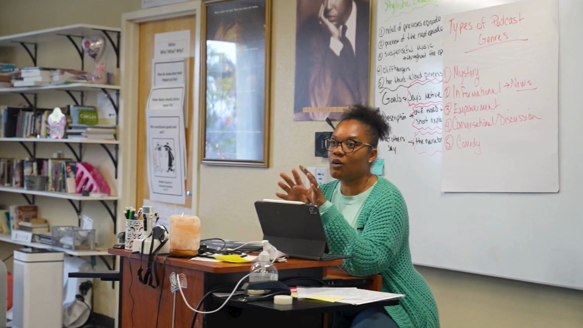 Screenshot from a video of a teacher sitting at a desk introducing a new project to a group of students in a classroom.